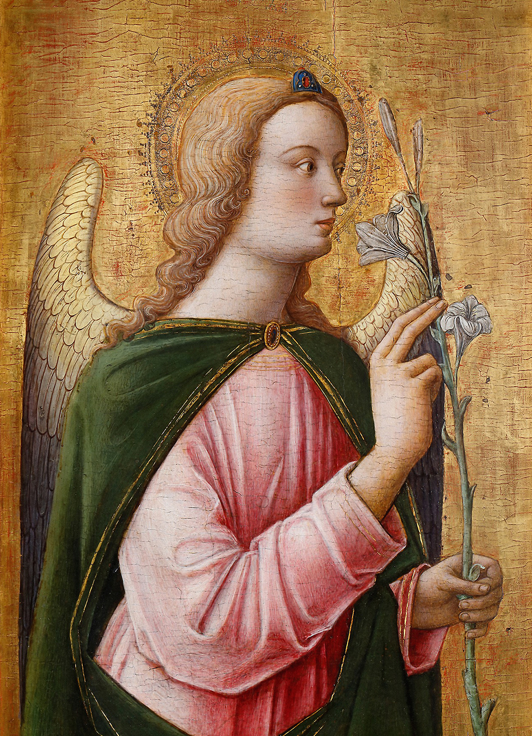 ※ 이 작품은 초기 르네상스 베네치아 화파의 성화 전통 안에서 대천사 가브리엘을 상징적이고 경건한 모습으로 제시한 작품으로, 금박 배경과 절제된 인물 표현은 중세 성화의 영적 전통을 유지하면서도 점차 인간적 형식을 갖추어 가던 미술사적 전환기의 특징을 보여 준다. 작가는 백합을 들고 옆모습으로 서 있는 천사의 단순하고 엄숙한 자세를 통해 수태고지의 순간을 암시적으로 표현하고자 하였으며, 장식적 금박과 정제된 선묘를 통해 하늘의 사자가 인간 역사 안에 하느님의 메시지를 전하는 신적 사명을 강조한다. 이러한 표현은 가브리엘이 구원의 역사 속에서 하느님의 뜻을 전달하는 천상 사자임을 상기시키며, 인간이 하느님의 말씀에 응답하는 신앙의 태도를 묵상하도록 이끈다.