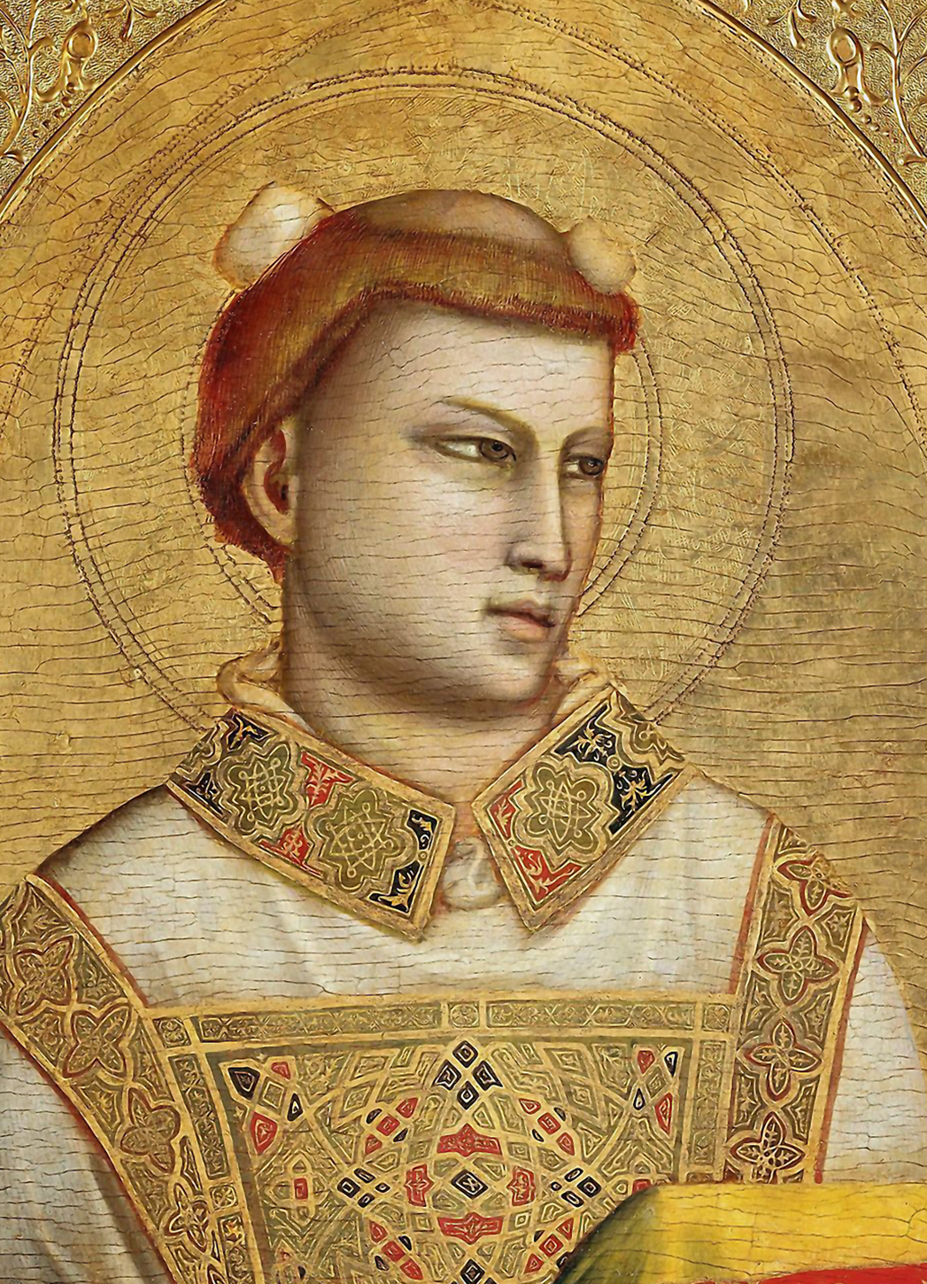※ 본 작품은 이탈리아 초기 르네상스 회화로 넘어가는 전환기 속에서 성인을 인간적 현실성과 영적 존엄을 함께 지닌 존재로 제시하는 성화에 해당한다. 작가 조토 디 본도네는 단순한 구도와 집중된 시선을 통해 성 스테파노의 내적 신앙과 순교자의 영적 권위를 표현하고자 하였으며, 이러한 표현은 초대 교회의 원순교자로서 그가 지닌 신앙의 증언과 교회의 기억을 묵상하도록 이끄는 신앙적 의미를 드러낸다.