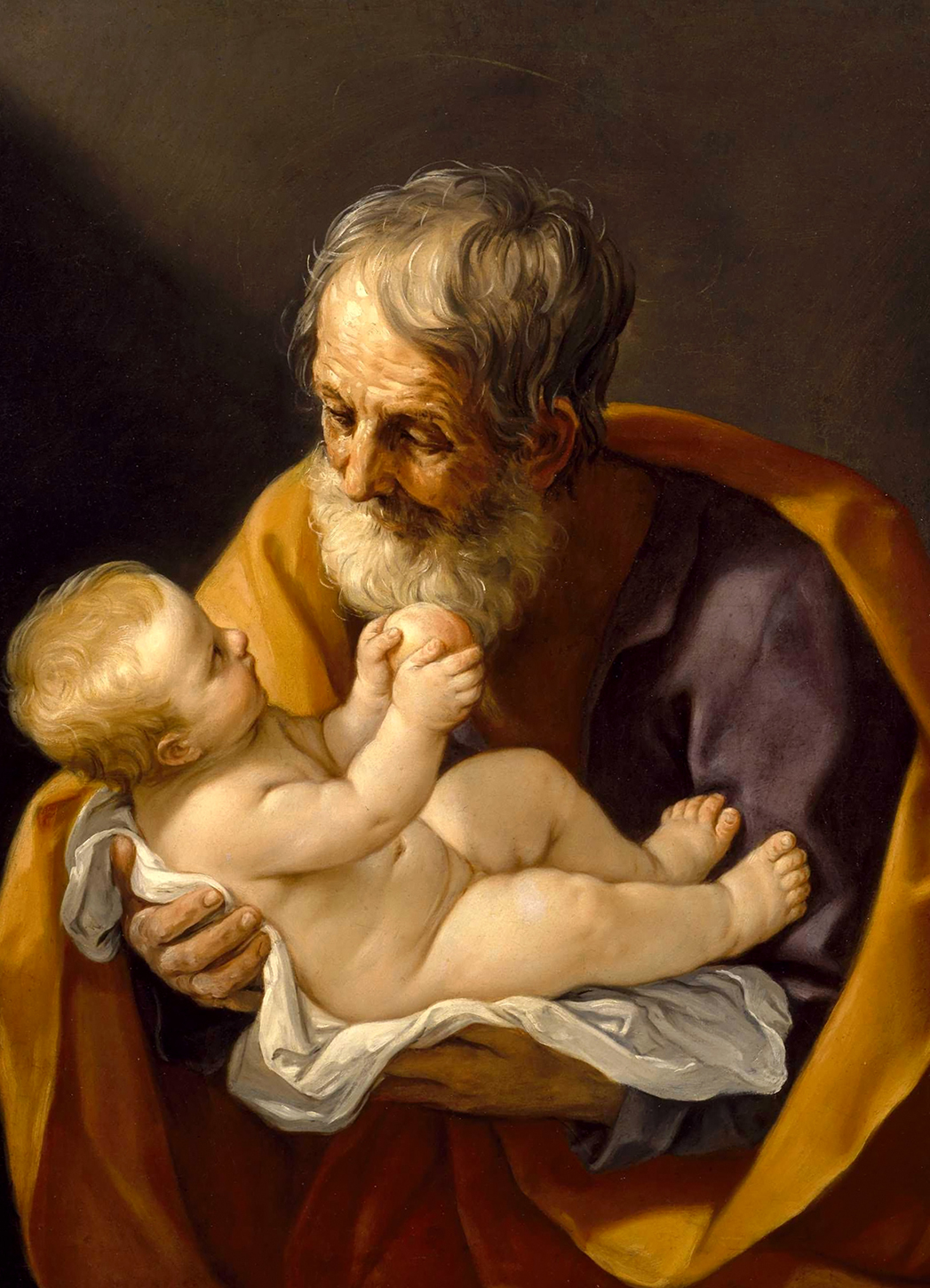 ※ 이 작품은 바로크 시대의 명암법을 활용하면서도 극적인 긴장 대신 침착한 친밀감을 선택하여, 성 요셉의 신앙을 위대한 행위가 아닌 맡겨진 존재를 조용히 받아들이는 태도로 제시한다. 구이도 레니는 부드럽게 스며드는 빛과 단순화된 구도를 통해, 아기 예수를 향한 요셉의 시선을 보호자이자 신뢰하는 인간의 시선으로 고정한다. 이 성화에서 신앙은 초월적 계시의 순간이 아니라, 일상의 품 안에서 지속되는 책임과 사랑의 관계로 나타나며, 하느님의 뜻은 웅변이 아닌 침묵 속 헌신으로 드러난다.