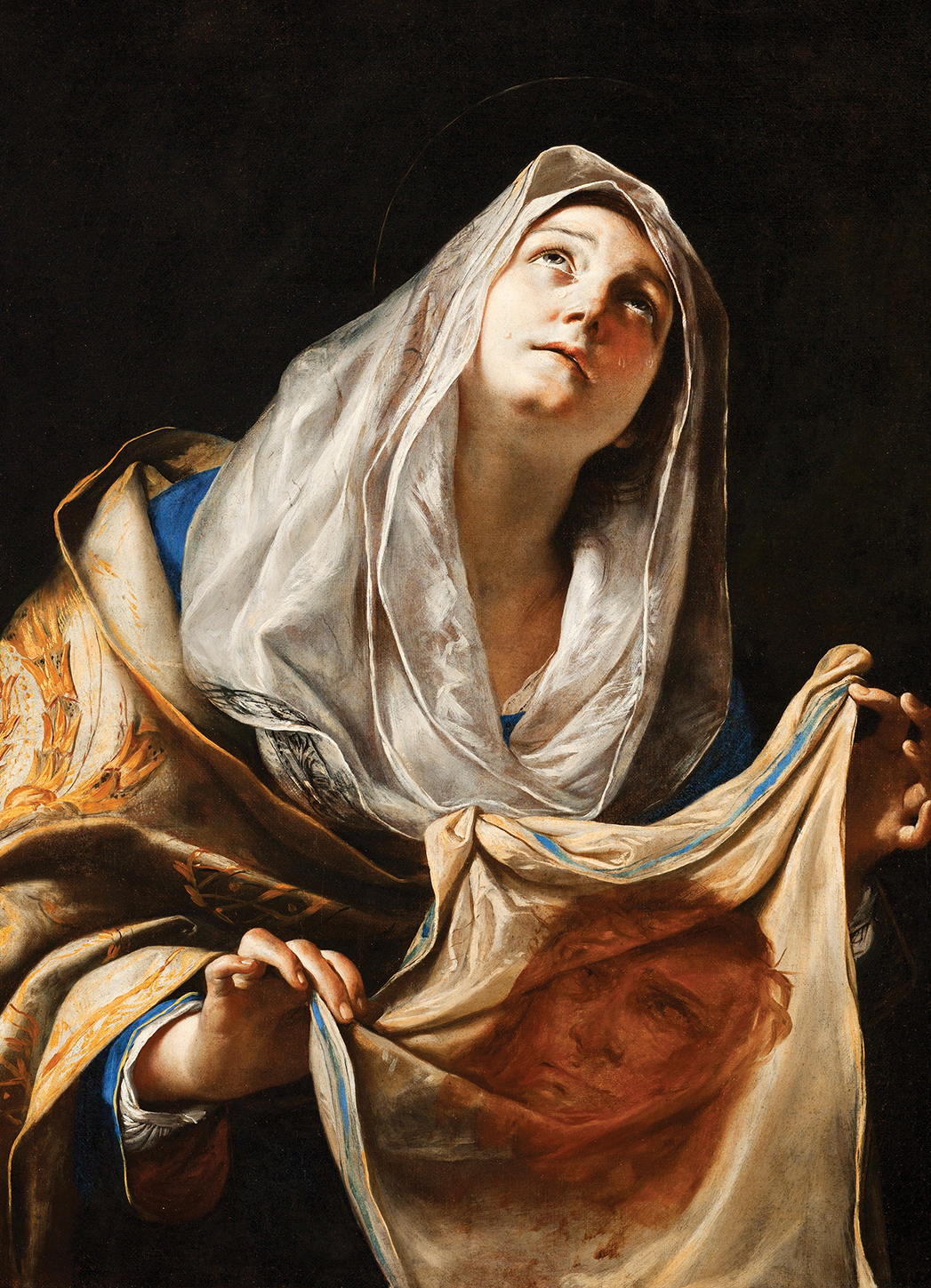 ※ 이 작품은 바로크의 극적인 명암 대비를 활용하면서도 사건의 재현 대신 ‘보여줌’의 형식을 선택한다. 마티아 프레티는 성녀의 얼굴을 빛 속에 두고 배경을 깊은 어둠으로 처리하여, 자비의 행위가 외적 소란이 아니라 내면의 결단이었음을 강조한다. 수건 위에 남은 성면은 단순한 기적의 표지가 아니라 고난을 마주한 인간의 응답을 상징하며, 관람자는 성녀의 위로 향한 시선을 따라 고통의 얼굴을 다시 바라보게 된다. 이 성화에서 신앙은 영웅적 장면이 아니라, 고통을 외면하지 않는 응시의 태도로 형상화된다.