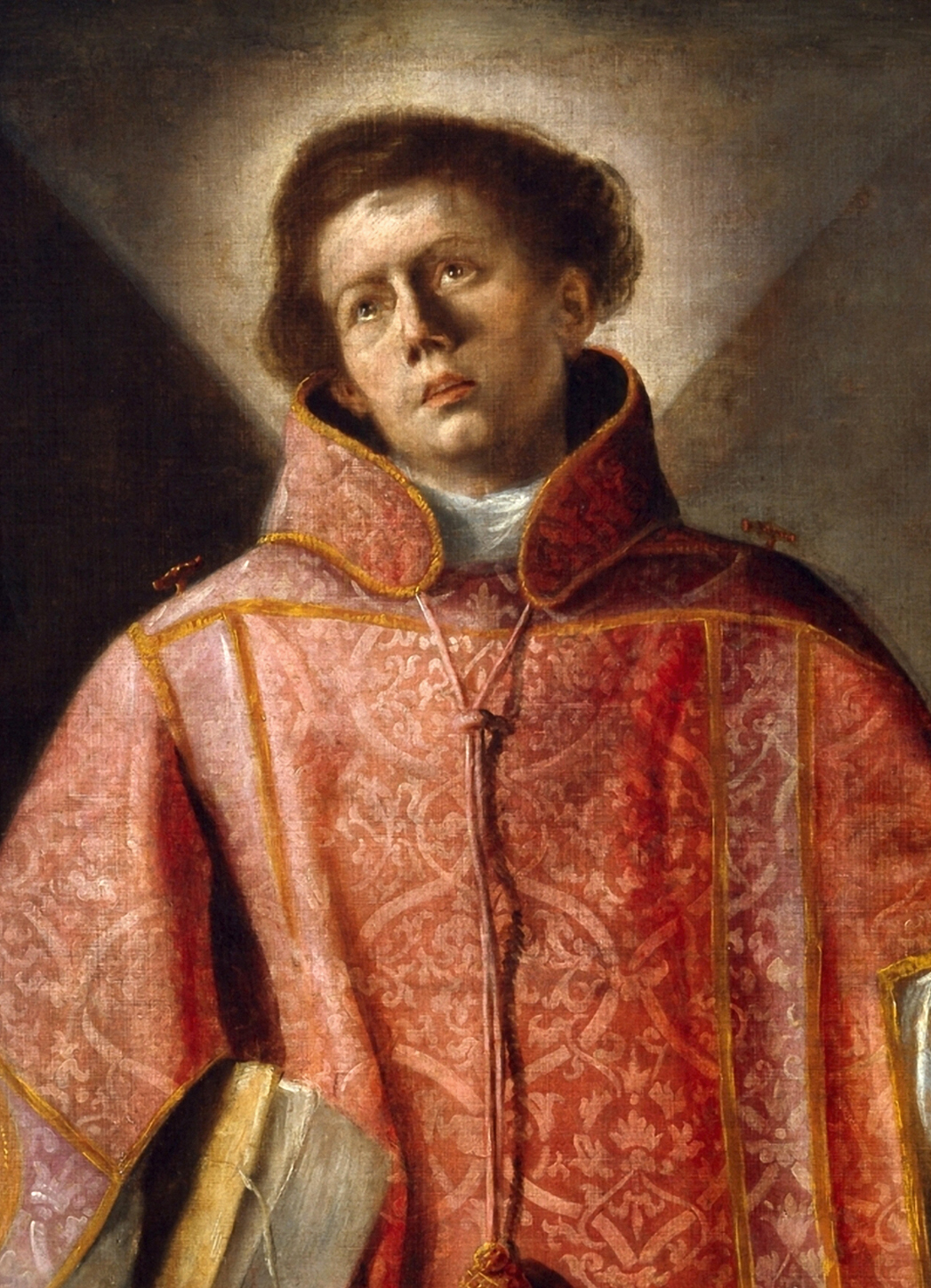 ※ 이 작품은 스페인 바로크 회화 특유의 강렬한 명암 표현을 통해 성 라우렌시오의 신앙적 결단과 순교의 영광을 강조한다. 작가는 하늘을 향한 시선과 빛에 드러난 얼굴을 통해 성인의 내적 신앙과 하느님을 향한 희망을 표현하며, 부제복의 장식적 표현을 통해 교회 안에서의 봉사와 직무를 상징적으로 드러낸다. 이 성화는 박해 속에서도 흔들리지 않는 믿음과 교회를 위한 봉사의 삶이 순교의 증언으로 완성될 수 있음을 묵상하게 하는 바로크 종교화의 한 예로 이해된다.