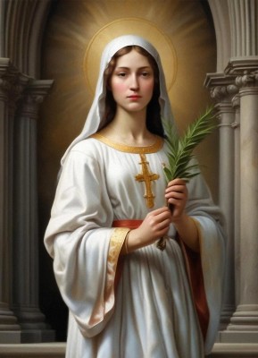 ※ 이 작품은 19세기 아카데믹 회화의 전통 속에서 제작된 것으로 보이며, 르네상스적 이상미와 신고전주의의 질서를 계승하여 인물을 시간과 감정의 동요로부터 분리된 상태로 제시한다. 작가는 극적인 순교 장면 대신 정적인 초상 형식을 선택함으로써, 성녀를 사건의 주인공이 아니라 이미 완성된 신앙의 상태로 드러내고자 했다. 이러한 선택은 신앙을 고통의 순간이 아니라 지속적으로 유지되는 내적 질서로 이해하려는 의도를 반영한다. 화면의 절제된 빛과 균형 잡힌 구도, 최소화된 상징은 신앙이 외적 과시가 아닌 내면의 고요 속에서 형성된다는 점을 강조하며, 종려나무는 그 고요가 결국 순교라는 결실로 이어졌음을 조용히 증언한다.