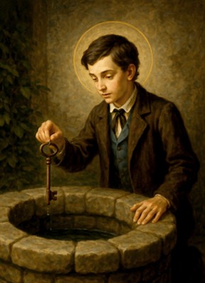 ※ 본 작품은 근현대 신심 미술의 상징적 서사 방식을 통해 성 도미니코 사비오의 신앙을 결단의 행위로 시각화한 성화에 해당한다. 화가는 열쇠를 우물에 내려놓는 집중된 동작과 하향 시선을 선택함으로써, 신앙을 추상적 다짐이 아니라 유혹을 스스로 차단하는 구체적 선택으로 해석한다. 절제된 후광과 단순한 배경은 이 행위를 극적 사건이 아닌 일상 속에서 반복되는 내적 규율의 한 장면으로 고정하며, 청소년 성덕이 순간의 열정보다 지속적인 자기 통제에서 형성됨을 분명히 제시한다.