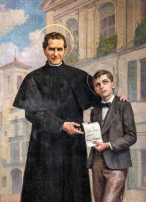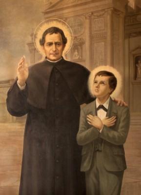 • 좌측의 **성 요한 보스코**는 사제복 차림으로 보호적 제스처를 취한다.