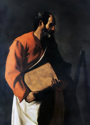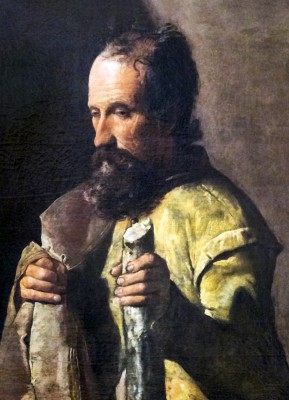 ※ 이 작품은 수르바란 특유의 절제된 테네브리즘을 통해 성인을 장엄한 영웅이 아니라 침묵 속에 서 있는 인간으로 제시한다. 작가는 장식과 배경을 배제하고, 빛과 어둠의 극단적 대비를 통해 인물의 고독과 내적 집중을 부각한다. 두 손으로 감싸 안은 책은 말씀에 대한 충실함을, 곁에 놓인 곤봉은 순교의 정체성을 조용히 드러낸다. 이 성화에서 신앙은 외적 드라마가 아니라, 고독한 자리에서 책임을 붙드는 태도로 제시되며, 어둠 속의 빛은 그 선택이 하느님을 향해 정렬되어 있음을 암시한다.