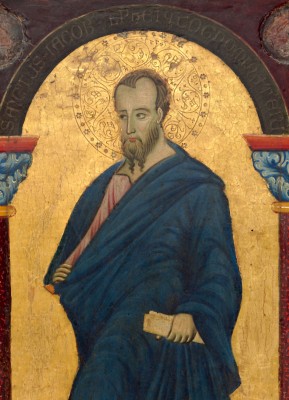 ※ 이 작품은 이탈리아 13세기 회화가 비잔틴 전통을 계승하면서 점차 인간적 표현으로 이행하는 과도기적 성격을 보여준다. 작가는 평면적 금박 배경과 엄격한 정면성을 유지하여 성인의 초월적 위상을 강조하는 동시에, 얼굴의 미묘한 표정과 옷 주름을 통해 인물의 존재감을 강화한다. 두루마리는 단순한 소품이 아니라 교회의 신앙 전승을 상징하며, 화면 전체는 역사적 인물의 서사보다 영원의 질서 속에 참여하는 성인의 상태를 드러낸다. 이 성화에서 신앙은 감정의 표현이 아니라 교회의 기억 안에 보존된 고백과 전승의 형식으로 제시된다.