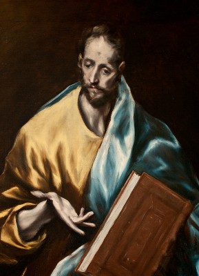 ※ 이 작품은 엘 그레코 후기 양식의 특징을 반영하여, 자연주의적 재현보다 영적 표현을 우선한다. 작가는 인체 비례를 의도적으로 길게 변형하고, 색채를 상징적으로 대비시켜 인물의 초월적 지향을 강조한다. 책은 교회의 가르침과 사도의 권위를 상징하며, 펼쳐진 손은 신앙의 증언과 전달의 행위를 암시한다. 이 성화에서 신앙은 안정된 균형이 아니라, 하느님을 향해 끌려 올라가는 내적 상승의 움직임으로 제시되며, 형상의 왜곡은 그 영적 긴장을 시각적으로 구현한다.