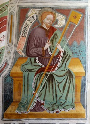 ※ 이 작품은 알프스 지역 후기 고딕 벽화의 전형을 보여주며, 장식성과 상징성이 강한 형식 속에 성인을 배치한다. 작가는 입체적 공간 구성보다는 평면적 구도와 선 중심의 표현을 통해 성인의 초월적 위상을 강조한다. 지팡이와 두루마리는 사도의 권위와 가르침을 상징하며, 화면 전체는 서사적 장면이 아니라 교회의 기둥으로서의 사도를 제시한다. 이 성화에서 신앙은 역사적 사건의 재현이 아니라, 전례 공간 안에서 성인을 기억하고 공경하는 공동체적 고백의 형식으로 드러난다.