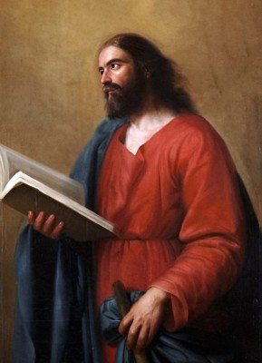 • 한 손에는 두꺼운 책을 끌어안고, 다른 손에는 곤봉을 쥐어 사도와 순교자의 상징을 동시에 제시한다.