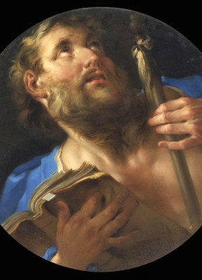 ※ 이 작품은 프랑스 바로크의 감정 표현과 극적인 조명을 통해 성인의 내적 열정을 강조한다. 포에르송은 원형 화면 구성을 활용하여 인물을 화면 중앙에 밀착시키고, 빛을 통해 얼굴과 손의 표정을 강조함으로써 신앙의 긴장과 고양을 시각화한다. 책을 가슴에 끌어안은 자세는 교회의 가르침에 대한 충실함을, 곤봉은 순교의 정체성을 명확히 드러낸다. 이 성화에서 신앙은 관조적 침묵을 넘어, 하느님을 향해 전 존재를 들어 올리는 열망의 태도로 제시된다.