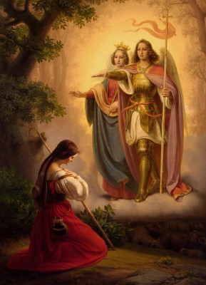 상징 : 갑옷(사명의 수행), 깃발(하느님의 부름), 검(결단과 싸움), 화형대(순교의 증거)