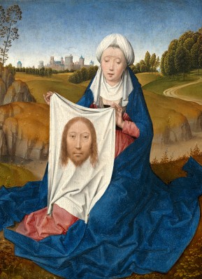 작가 : 한스 멤링 (Hans Memling) 연대 : 1483년경 소장 : 워싱턴 국립미술관(National Gallery of Art, Washington) 기법·시대 : 패널에 유채, 북유럽 초기 르네상스 유형 : 이연화 제단화(성면 제시형) 특징 : • 넓은 풍경 배경은 인물을 시간과 공간 속 역사적 현실 안에 위치시킨다. • 정면에 가까운 안정된 구도는 성면을 화면의 중심 축으로 강조한다. • 푸른 망토의 넓은 면적은 성녀의 고요한 내면을 시각적으로 확장한다. • 수건 위의 그리스도 얼굴은 섬세하고 사실적인 묘사로 중심 초점을 형성한다. • 원근법적 길과 성곽 도시는 인간 역사와 구원의 사건을 연결한다. ※ 이 작품에서 한스 멤링은 바로크적 극적 긴장 대신, 북유럽 회화 특유의 세밀함과 투명한 공간 구성을 통해 성면의 의미를 조용히 드러낸다. 성녀는 감정의 격렬함 없이 수건을 펼쳐 보이며, 그 행위 자체가 증언의 형식이 된다. 배경의 도시와 길은 사건을 특정한 역사적 세계 안에 위치시키면서도, 성면은 그 시간을 초월해 관람자를 직접 마주한다. 이 성화에서 신앙은 순간적 영웅성이 아니라, 기억을 보존하고 전하는 침묵의 제시로 형상화된다.