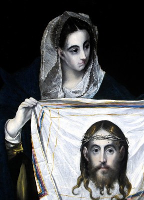 작가 : 엘 그레코 (El Greco) 연대 : 1580년경 소장 : 산타 크루스 미술관(Museo de Santa Cruz, Toledo) 기법·시대 : 유채, 스페인 르네상스 후기·매너리즘 유형 : 성녀 단독상(성면 제시형) 특징 : • 어두운 배경 위에 인물과 수건만을 부각시키는 강한 명암 대비가 형성된다. • 길게 늘어진 얼굴과 손의 비례는 매너리즘적 왜곡을 보여준다. • 차가운 색조의 피부 표현은 영적 긴장감을 강화한다. • 수건 위의 그리스도 얼굴은 정면 응시로 화면의 중심을 형성한다. • 붓질은 유려하지만 세부 묘사는 절제되어 신비로운 분위기를 만든다. ※ 엘 그레코는 인체의 비례를 의도적으로 늘이고 형태를 세속적 현실에서 분리함으로써, 성녀의 행위를 역사적 사건이 아니라 영적 현현의 차원으로 끌어올린다. 베로니카는 관람자를 향해 직접 시선을 두지 않고, 수건 위의 성면을 제시하는 매개자로 서 있다. 어둠 속에서 떠오르는 얼굴과 성면은 서로 다른 차원의 빛을 형성하며, 신앙이 감각적 사실을 넘어 내적 계시로 전환되는 과정을 시각화한다. 이 작품에서 자비의 행위는 기억의 보존을 넘어, 인간과 신적 얼굴이 마주하는 신비의 순간으로 형상화된다.