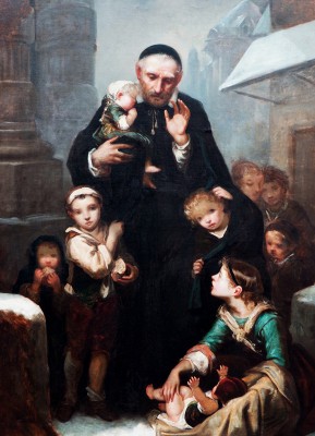 ※ 이 작품은 19세기 종교화 전통 속에서 성 빈첸시오 드 폴의 자선 사도직을 인간적이고 서정적인 장면으로 표현한 작품으로, 성인을 중심으로 아이들이 모여드는 구도와 부드러운 빛의 사용은 사회적 약자를 돌보는 교회의 사명을 강조하는 미술사적 특징을 보여 준다. 작가는 한 아이를 품에 안고 다른 아이들을 축복하는 성인의 모습을 통해 권위적 지도자라기보다 자애로운 목자의 모습을 드러내고자 하였으며, 다양한 표정의 아이들을 통해 가난한 이들의 현실적 고통과 도움을 향한 희망을 동시에 표현한다. 이러한 장면은 가난한 이들 안에서 그리스도를 섬긴 성 빈첸시오의 영성을 시각적으로 드러내며, 사랑과 돌봄의 실천이 곧 복음을 살아가는 길이라는 신앙적 메시지를 전한다.
