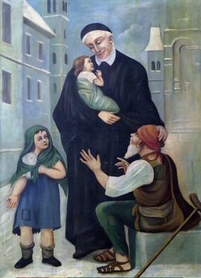 • 성 빈첸시오는 고아와 빈민 아이들 사이에 서서 한 아이를 품에 안고 다른 아이들을 축복하는 모습으로 묘사된다.