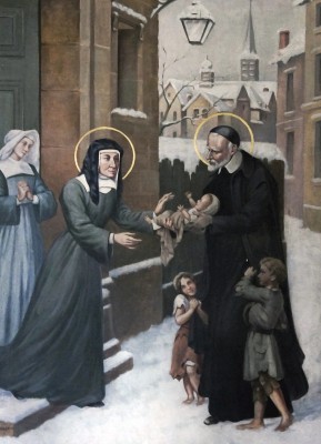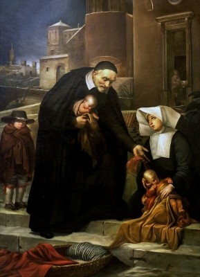 • 성 빈첸시오 드 폴은 버려진 유아를 품에 안고 사랑의 딸회 수녀에게 또 다른 아이를 맡기는 장면으로 묘사된다.