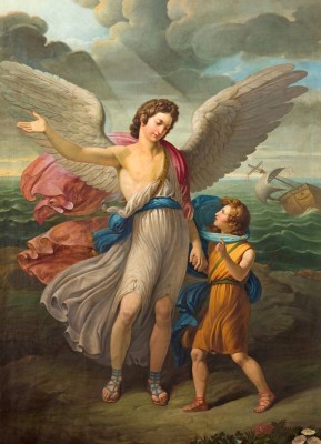 작가 : 안드레아 바카로(Andrea Vaccaro) 연대 : 1640년경 소장 : 카탈루냐 국립 미술관(Museu Nacional d’Art de Catalunya), 바르셀로나 기법·시대 : 캔버스에 유채, 이탈리아 바로크 유형 : 성서 서사화(「토비트기」 장면) 특징 • 대천사 라파엘은 날개 달린 젊은 남성의 모습으로 표현되어 하느님의 사자임을 드러낸다. • 라파엘의 펼친 팔과 앞으로 내딛는 발걸음은 여정의 방향을 제시하는 인도자의 역할을 강조한다. • 토비아가 라파엘의 손을 잡고 따르는 모습은 인간이 하느님의 인도에 의탁함을 상징한다. • 배와 거친 바다는 여정 속 위험과 시련을 암시한다. • 부드러운 색조와 유려한 옷자락 표현은 극적 긴장보다 보호와 인도의 분위기를 형성한다. ※ 이 작품은 이탈리아 바로크 회화가 지닌 유려한 인물 표현과 부드러운 명암을 통해 성서 서사를 서정적으로 풀어낸 사례이다. 안드레아 바카로는 라파엘의 앞선 걸음과 토비아의 따르는 동작을 대비시키며, 하느님의 사자가 인간의 여정을 인도한다는 「토비트기」의 이야기를 시각적으로 분명히 드러내고자 하였다. 이러한 장면은 인간이 하느님의 인도에 의탁하여 삶의 위험과 시련을 지나간다는 신앙적 의미를 전달하며, 관람자로 하여금 하느님의 보호와 동행을 묵상하도록 이끈다.