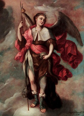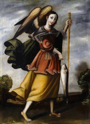 작가 : 미겔 카브레라(Miguel Cabrera) 연대 : 1750년경 소장 : 멕시코 국립 미술관(Museo Nacional de Artes), 멕시코시티 기법·시대 : 캔버스에 유채, 식민지 바로크(누에바 에스파냐) 유형 : 성인 단독상(대천사 표현) 특징 • 대천사 라파엘을 단독 인물로 묘사하면서도 「토비트기」 전통을 반영한 상징을 유지한다. • 라파엘은 지팡이를 들고 물고기를 품에 안아 여정의 인도자이자 치유의 천사라는 역할을 드러낸다. • 배경에 축소된 서사 장면을 삽입하여 토비아를 인도하는 이야기의 맥락을 암시적으로 연결한다. • 온화한 얼굴 표정과 부드러운 명암 처리, 유연한 옷자락 표현은 자비와 보호의 성격을 강조한다. • 따뜻한 색조와 장식적 감각은 식민지 바로크 회화가 유럽 전통을 현지 신심과 결합하여 재해석한 특징을 보여 준다. ※ 이 작품은 누에바 에스파냐 식민지 바로크 미술이 유럽 종교 도상을 현지 신심과 결합하여 발전시킨 대표적 사례로 평가된다. 미겔 카브레라는 지팡이와 물고기라는 전통적 상징과 배경 서사를 통해 대천사 라파엘을 인간의 여정을 인도하고 치유를 전하는 하느님의 사자로 분명히 제시하고자 하였으며, 온화한 인물 표현과 장식적 색채를 통해 보호와 자비의 이미지를 강조하였다. 이러한 표현은 라파엘을 치유와 동행의 천사로 공경하는 교회의 신앙 전통을 반영하며, 하느님의 보호와 섭리가 인간의 삶 속에서 함께한다는 신앙적 의미를 묵상하도록 이끈다.