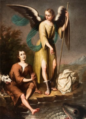 작가 : 스페인 화파(Spanish School, 작자 미상) 연대 : 17세기 소장 : 개인 소장 기법·시대 : 캔버스에 유채, 스페인 바로크 유형 : 성서 서사화(「토비트기」 장면) 특징 • 구약성서 「토비트기」에 근거하여 대천사 라파엘이 소년 토비아를 인도하는 장면을 묘사한다. • 라파엘은 지팡이를 들고 앞으로 나아가며 손짓으로 길을 가리키는 ‘인도자’의 제스처를 취한다. • 화면 하단의 물고기는 토비트기의 이야기에서 유래한 치유의 도구로, 라파엘의 치유적 성격을 상징한다. • 전투적 장면이나 무력의 과시는 배제되고 부드러운 시선과 절제된 동작을 통해 보호자이자 동반자로서의 천사상이 강조된다. • 따뜻한 황색과 녹색 계열의 색채와 완만한 명암 대비는 온화하고 신심적인 분위기를 형성한다. ※ 이 작품은 스페인 바로크 종교회화 전통 속에서 성서 서사를 감정적으로 설득력 있게 전달하려는 특징을 보여 준다. 작가는 라파엘의 손짓과 지팡이를 통해 그가 토비아의 여정을 인도하는 하느님의 사자임을 분명히 제시하고자 하였으며, 물고기라는 상징을 통해 「토비트기」의 치유 이야기를 시각적으로 강조하였다. 이러한 표현은 대천사 라파엘을 전투적 존재가 아니라 치유와 인도의 천사로 이해하는 교회의 신앙 전통을 반영하며, 하느님의 보호와 인도가 인간의 여정 속에서 함께한다는 신앙적 의미를 묵상하도록 이끈다.
