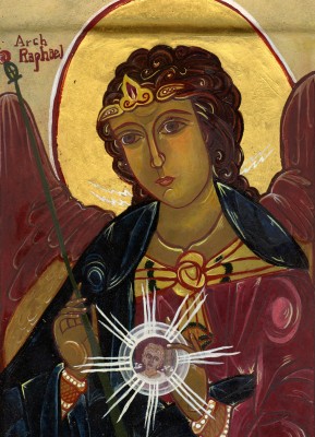 작가 : 미상(전통 성화 제작) 연대 : 현대 제작(비잔틴·정교회 전통 양식 계승) 소장 : 개인 소장 / 예배용 성화 기법·시대 : 목판 또는 캔버스에 템페라, 금박 배경 / 비잔틴 성화 전통 유형 : 정면 아이콘(Icon) 특징 • 금박 배경은 하늘의 영역과 영원성을 상징하며 시간과 공간을 초월한 천상의 차원을 드러낸다. • 정면을 응시하는 얼굴과 엄격한 대칭 구도는 기도와 묵상을 위한 성화 전통의 본질을 반영한다. • 오른손의 지팡이는 하느님의 사자로서 인간의 여정을 인도하는 권위를 상징한다. • 왼손의 원형 문장(방패)은 치유와 보호, 하느님의 명령을 수행하는 사명을 상징적으로 나타낸다. • 녹색과 청록색 의복은 치유와 생명, 회복이라는 라파엘의 역할을 시각적으로 드러낸다. • 양쪽의 “ARCHANGEL / RAPHAEL” 명문은 인물의 정체를 밝히는 전통적 이콘 도상 요소이다. ※ 이 작품은 비잔틴 성화 전통을 계승한 현대 아이콘으로, 사실적 묘사보다 신학적 상징과 영적 현존을 강조하는 성화 미술의 특징을 보여 준다. 작가는 정면 구도와 금박 배경, 상징적 도상을 통해 대천사 라파엘을 하느님의 치유와 보호를 수행하는 천상 사자로 분명히 제시하고자 하였으며, 지팡이와 방패를 통해 그의 인도자이자 수호자로서의 사명을 시각적으로 드러낸다. 이러한 표현은 성화를 단순한 그림이 아니라 기도와 묵상을 위한 창으로 이해하는 동방 교회의 전통을 반영하며, 신자에게 하느님의 치유와 보호가 삶 속에서 함께한다는 신앙적 의미를 깊이 묵상하도록 이끈다.