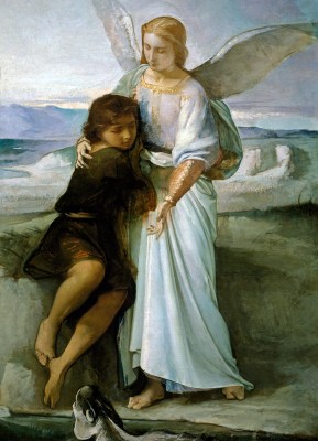 작가 : 에두아르도 로살레스(Eduardo Rosales) 연대 : 1858–1860년경 소장 : 프라도 미술관(Museo del Prado), 마드리드 기법·시대 : 캔버스에 유채, 19세기 스페인 사실주의 유형 : 성서 서사화(「토비트기」 장면) 특징 • 「토비트기」에 근거하여 대천사 라파엘이 위험에 처한 소년 토비아를 보호하고 인도하는 장면을 묘사한다. • 라파엘은 토비아를 감싸듯 이끌며 한 손으로 길을 가리켜 보호와 인도의 역할을 드러낸다. • 화면 하단의 물고기는 토비트의 치유에 사용될 도구를 암시하며 라파엘의 치유 사명을 상징한다. • 천사의 표정과 몸짓은 권능의 과시보다 연민과 온유함을 강조하며 토비아의 불안한 자세와 대비된다. • 배경 풍경은 구체적 서사를 최소화하여 인물 간의 정서적 관계에 시선을 집중시킨다. ※ 이 작품은 19세기 스페인 사실주의 회화가 성서 이야기를 인간적인 감정과 현실적 표현으로 재해석한 사례로 이해된다. 에두아르도 로살레스는 라파엘이 토비아를 감싸며 인도하는 장면을 중심으로 천사가 인간의 삶에 직접 개입하는 보호자의 역할을 강조하고자 하였으며, 절제된 배경과 인물의 감정 표현을 통해 두 존재 사이의 관계에 집중하도록 구성하였다. 이러한 표현은 대천사 라파엘을 치유와 인도의 사자로 공경하는 교회의 신앙 전통을 반영하며, 하느님의 보호와 자비가 인간의 연약함 속에서 함께한다는 신앙적 의미를 묵상하도록 이끈다.