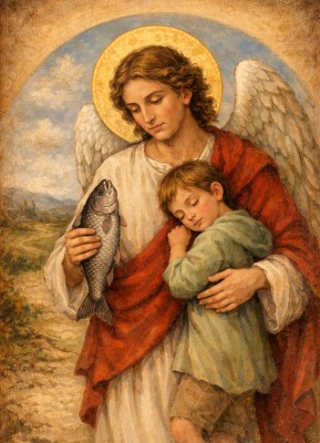 작가 : 작자 미상(현대 성화 제작) 연대 : 현대 제작 소장 : 개인 소장 / 교육·신심용 성화 기법·시대 : 캔버스 또는 디지털 성화, 현대 신심 성화 유형 : 신심 성화(교육적 성화 표현) 특징 • 토비트기의 전승에 따라 대천사 라파엘의 치유와 보호, 인도라는 역할을 어린이의 시각에서 이해하기 쉽게 표현한다. • 라파엘이 들고 있는 물고기는 토빗의 시력을 회복시키는 데 사용된 치유의 약재를 상징한다. • 천사가 아이들을 품에 안은 모습은 여행과 삶의 길에서 인간을 보호하는 동반자의 의미를 강조한다. • 금빛 후광과 펼쳐진 날개는 천상적 존재로서의 신성을 드러낸다. • 온화한 표정과 부드러운 색조는 어린이들에게 친근하고 안정적인 정서를 전달한다. ※ 이 작품은 전통적인 성화 도상을 바탕으로 대천사 라파엘의 신학적 의미를 어린이 신앙 교육의 관점에서 재해석한 현대 신심 성화이다. 작가는 물고기와 보호의 몸짓이라는 상징을 통해 라파엘을 치유와 인도의 천사로 분명히 제시하고자 하였으며, 아이들을 품에 안은 모습으로 하느님의 보호가 인간의 삶에 가까이 함께한다는 의미를 강조하였다. 이러한 표현은 대천사 라파엘을 병자와 여행자의 수호자로 공경하는 교회의 전통을 반영하며, 어린 신자들에게 하느님의 치유와 위로가 삶 속에서 늘 함께한다는 신앙적 메시지를 전달한다.
