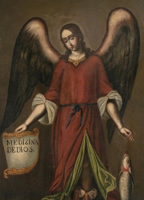 작가 : 식민지 화파(Colonial School, 작가 미상) 연대 : 17세기 소장 : 개인 소장 기법·시대 : 캔버스에 유채, 식민지 바로크 유형 : 성인 단독상(대천사 표현) 특징 • 펼친 날개와 정면 자세로 대천사의 위엄과 사명성을 강조한다. • “MEDIZINA DE DIOS(하느님의 약)”라는 문구로 치유의 역할을 직접적으로 제시한다. • 물고기를 들고 있는 모습은 「토비트기」에 전해지는 치유 서사를 상징적으로 드러낸다. • 절제된 배경과 상징 중심의 구성은 신심 교육을 위한 종교 이미지로서의 성격을 보여 준다. ※ 이 작품은 라틴아메리카 식민지 종교미술 전통 속에서 성 라파엘 대천사를 치유와 보호의 상징으로 강조한 성화이다. 작가는 정면 구도와 상징적 요소들을 통해 라파엘을 하느님의 치유를 전달하는 사자로 분명히 제시하고자 하였으며, 물고기와 문구를 결합하여 「토비트기」의 치유 서사를 시각적으로 명확하게 드러낸다. 이러한 표현은 성화를 신앙 교육과 신심 고양의 도구로 사용했던 식민지 바로크 미술의 특징을 보여 주며, 관람자로 하여금 하느님의 치유와 보호가 인간 삶 속에 함께한다는 신앙적 의미를 묵상하도록 이끈다.