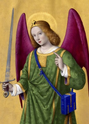 작가 : 장 부르디숑(Jean Bourdichon) 연대 : 1503–1508년경 소장 : 프랑스 국립도서관(Bibliothèque nationale de France), 파리 기법·시대 : 양피지에 채색·금박 미니어처, 프랑스 궁정 후기 고딕–초기 르네상스 유형 : 성인 단독상(대천사 표현, 필사본 삽화) 특징 • 붉은 날개와 금빛 배경은 대천사의 위계와 천상적 영광을 강조한다. • 검은 정의와 보호의 권위를, 푸른 성서 가방은 하느님의 말씀과 사명을 상징한다. • 부드러운 얼굴 표현과 우아한 색채는 프랑스 궁정 미니아투르 특유의 세련된 미감을 보여 준다. • 개인 기도서를 위한 삽화로 제작되어 교리적 명확성과 장식적 완성도를 동시에 추구한다. ※ 이 작품은 프랑스 궁정 후기 고딕에서 초기 르네상스로 넘어가는 시기의 필사본 미니아투르 전통을 보여 주는 작품으로, 금박 배경과 정교한 채색을 통해 천상의 위계를 장식적으로 표현한 궁정 신심 미술의 특징을 잘 드러낸다. 장 부르디숑은 검과 성서 가방이라는 상징적 도상을 통해 대천사 라파엘을 하느님의 정의와 보호를 수행하는 사자로 명확히 제시하고자 하였으며, 인물의 우아한 자세와 장식적 색채를 통해 궁정 필사본 미술 특유의 세련된 표현을 완성하였다. 이러한 이미지는 개인 기도서를 사용하는 신자가 묵상 속에서 하느님의 보호와 인도를 기억하도록 돕는 신앙적 기능을 수행하며, 천상의 사자가 인간의 삶을 돌본다는 교회의 전통적 믿음을 시각적으로 전하는 역할을 한다.