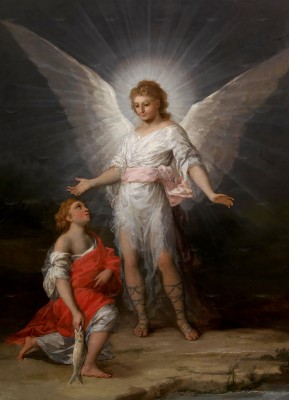 작가 : 프란시스코 데 고야(Francisco de Goya) 연대 : 1787년경 소장 : 프라도 미술관(Museo del Prado), 마드리드 기법·시대 : 캔버스에 유채, 스페인 후기 바로크–초기 낭만주의 이행기 유형 : 성서 사건화(「토비트기」 장면) 특징 • 대천사 라파엘이 어린 토비아스를 인도하는 「토비트기」의 핵심 장면을 묘사한다. • 강렬한 역광과 빛의 확산은 천상적 현존과 계시의 순간을 강조한다. • 토비아스가 들고 있는 물고기는 치유와 구원의 상징을 분명히 드러낸다. • 이상화된 고전적 인체 표현 속에 고야 특유의 인간적 감정과 서정성이 반영된다. ※ 이 작품은 스페인 회화가 후기 바로크에서 새로운 감수성으로 넘어가던 시기의 종교화를 보여 주는 사례로, 극적인 빛의 연출과 인물 표현을 통해 성서 장면을 생동감 있게 제시한다. 고야는 대천사 라파엘과 토비아스의 동행을 강조함으로써 하느님의 섭리가 인간의 여정 속에서 작용한다는 의미를 시각적으로 드러내고자 하였으며, 천사의 인도와 인간의 신뢰를 한 장면 안에 결합하였다. 이러한 표현은 「토비트기」의 이야기를 통해 하느님의 보호와 치유가 인간 삶의 길 위에서 실현된다는 신앙적 메시지를 관람자에게 묵상하도록 이끈다.
