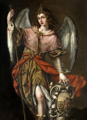 작가 : 후안 데 발데스 레알(Juan de Valdés Leal) 연대 : 17세기 후반 소장 : 비아나 궁전(Palacio de Viana), 코르도바 기법·시대 : 캔버스에 유채, 스페인 바로크 유형 : 성인 단독상(대천사 표현) 특징 • 왕관과 화려한 의복은 대천사의 위계와 천상적 영광을 강조한다. • 오른손의 지팡이와 왼손의 방패형 메달리온은 도시의 수호자로서의 역할을 상징한다. • 강한 명암 대비와 역동적인 자세는 발데스 레알 특유의 극적 바로크 표현을 보여 준다. • 방패 속 소형 장면은 코르도바를 보호하는 라파엘의 전승을 상징적으로 드러낸다. ※ 이 작품은 스페인 바로크 회화가 지닌 극적 명암과 강렬한 종교적 표현을 보여 주는 사례로, 대천사 라파엘을 도시의 수호자로 강조하는 지역 신심 미술의 성격을 잘 드러낸다. 발데스 레알은 왕관과 상징적 도상을 통해 라파엘을 하느님의 권능을 수행하는 천상 사자로 표현하고자 하였으며, 지팡이와 메달리온을 결합하여 그의 보호와 인도라는 사명을 시각적으로 분명히 제시한다. 이러한 이미지는 코르도바 신자들에게 대천사의 보호와 하느님의 섭리가 공동체 위에 머문다는 신앙적 의미를 상기시키는 전례적·신심적 기능을 수행한다.
