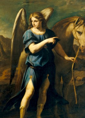 작가 : 안드레아 바카로(Andrea Vaccaro) 연대 : 1640년경 소장 : 카탈루냐 국립 미술관(Museu Nacional d'Art de Catalunya), 바르셀로나 기법·시대 : 캔버스에 유채, 이탈리아 바로크 유형 : 성서 사건화(「토비트기」 장면, 부분 detail) 특징 • 대천사 라파엘은 젊은 남성의 모습과 날개로 표현되어 하느님의 사자임을 드러낸다. • 라파엘의 가리키는 손짓은 여정의 방향을 제시하는 ‘인도자’의 역할을 상징한다. • 라파엘이 말의 고삐를 잡고 있는 모습은 보호자이자 동행자로서의 성격을 강조한다. • 푸른 옷과 부드러운 명암 처리는 긴장감보다 차분한 안내와 보호의 분위기를 형성한다. • 화면이 부분(detail)으로 제시되어 원 장면의 동반자(토비아 등)가 화면 밖에 있음을 전제한다. ※ 이 작품은 이탈리아 바로크 회화가 지닌 사실적 인물 표현과 부드러운 명암 효과를 통해 성서 장면을 생동감 있게 제시하는 사례이다. 안드레아 바카로는 대천사 라파엘의 몸짓과 시선을 강조하여 그가 토비아의 여정을 인도하는 하느님의 사자임을 시각적으로 드러내고자 하였으며, 손짓과 고삐라는 구체적 행위를 통해 보호와 안내라는 역할을 명확히 표현하였다. 이러한 장면은 「토비트기」의 이야기를 바탕으로 하느님의 섭리가 인간의 여정 속에서 동행한다는 신앙적 의미를 전달하며, 관람자로 하여금 하느님의 인도와 보호를 묵상하도록 이끈다.
