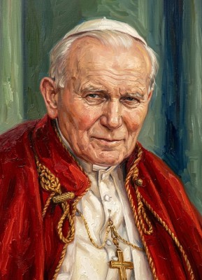 작가 : 미상 연대 : 20세기 후반–21세기 초 소장 : 미상 기법·시대 : 유화, 현대 유형 : 인물 초상 성화 특징 : • 인물의 상반신을 중심으로 한 근접 구도는 시선을 얼굴에 집중시키며, 관람자와의 직접적인 관계를 형성한다. • 붉은 망토와 금빛 장식은 화면에서 강한 색채 대비를 이루며 교황의 상징성과 영적 권위를 강조한다. • 부드러운 붓질과 섬세한 색조 변화는 피부의 온기와 인간적인 표정을 자연스럽게 드러낸다. • 배경은 흐릿하게 처리되어 인물만이 부각되며, 외적 환경보다 내면의 상태에 주의를 집중시킨다. ※ 이 작품은 현대 초상화적 접근을 통해 성 요한 바오로 2세를 상징적 권위의 표상으로만이 아니라 인간적 깊이를 지닌 신앙인으로 제시하며, 작가는 부드러운 색조와 절제된 배경을 통해 인물의 내면을 강조하고, 신앙적으로는 긴 생애 속에서 형성된 믿음이 얼굴과 시선 속에 조용히 스며들어 드러난다는 점을 보여준다.