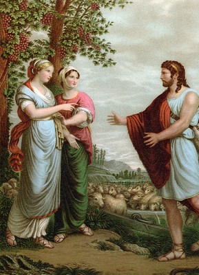 • 화면은 야곱이 두 여인, 레아와 라헬 앞에 서서 손을 내미는 순간을 중심 장면으로 구성한다.