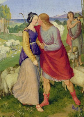 ※ 이 작품은 낭만주의 회화 특유의 감정적 친밀성을 통해 라헬을 단순한 서사의 등장인물이 아니라, 관계의 방향을 결정짓는 내적 중심 인물로 제시한다. 화가는 야곱의 적극적인 행위보다 라헬의 조용한 수용과 신체의 밀착을 강조함으로써, 성서의 만남을 즉각적인 사랑의 완성이 아닌 시간과 인내 속에서 성숙되는 관계의 출발점으로 해석한다. 이는 라헬을 ‘선택의 대상’이 아니라 ‘응답의 주체’로 바라보게 하는 시각적 신학이라 할 수 있다.
