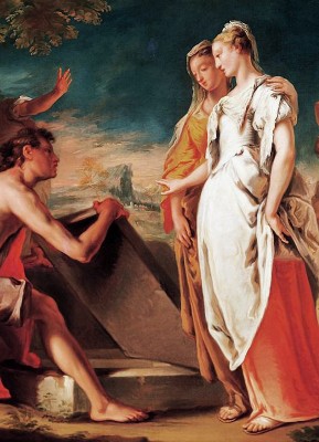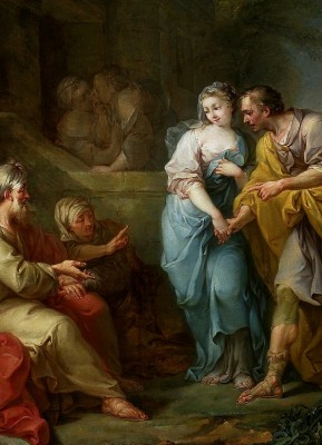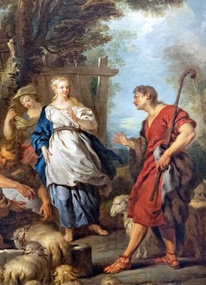 ※ 이 작품은 로코코 특유의 우아함과 서정성을 통해 라헬을 사건의 ‘대상’이 아니라 관계의 리듬을 조율하는 중심 인물로 제시한다. 화가는 야곱의 적극적 접근을 강조하기보다 라헬의 자세, 빛을 받은 의복, 미묘한 표정에 시선을 집중시켜, 성서의 만남을 즉각적인 결합이 아닌 응답을 준비하는 침묵의 시간으로 해석한다. 이는 라헬의 삶을 성취 이전의 기다림과 내적 선택의 여정으로 이해하게 하는 회화적 신학이라 할 수 있다.