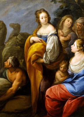※ 본 작품은 17세기 이탈리아 바로크가 성서 서사를 감정의 폭발이 아닌 조화와 질서 속에서 재구성하려 한 경향을 반영한다. 코르토나 공방은 결혼이라는 결정적 사건을 극적 선언으로 처리하지 않고, 인물 간 신체적 거리와 손의 연결을 통해 관계가 제도와 시간 속에 편입되는 과정을 시각화한다. 이는 라헬을 서사의 결과물이 아니라, 선택 이후에도 지속되는 관계의 중심 인물로 이해하게 하는 바로크적 해석이라 할 수 있다.