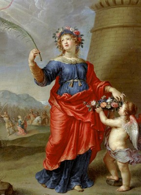 작가 : 피터르 판 린트(Pieter van Lint) 연대 : 1669년 소장 : 개인 소장 기법·시대 : 유화, 바로크 시대 유형 : 성인 단독상(동정 순교자) 특징 : • 성녀 바르바라는 우아한 전신상으로 묘사되어 화면의 중심 인물로 제시된다. • 화면 우측의 탑은 성녀가 감금되었던 장소를 상징한다. • 손에 든 종려가지는 순교자의 승리를 나타낸다. • 천사가 성녀의 머리에 화관을 씌우는 장면은 하늘의 영광과 순교자의 승인을 표현한다. • 붉은 망토와 푸른 의복의 대비는 순교의 피와 신앙의 충실함을 상징적으로 드러낸다. ※ 본 작품은 플랑드르 바로크 회화 전통 속에서 성인을 영광 속의 순교자로 묘사하는 성인 단독상에 해당한다. 작가 피터르 판 린트는 탑과 종려가지, 그리고 천사의 화관 장면을 통해 성녀 바르바라의 순교와 하늘의 영광을 동시에 드러내고자 하였으며, 이러한 표현은 고난을 넘어 하느님 안에서 완성되는 순교자의 승리를 묵상하게 하는 신앙적 의미를 전달한다.