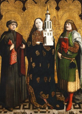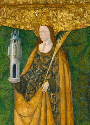 작가 : 작자 미상 연대 : 15세기 제3사분기 소장 : 카탈루냐 국립미술관 기법·시대 : 템페라 및 금박, 후기 고딕 유형 : 성인 단독상(동정 순교자) 특징 : • 성녀 바르바라는 정면에 가까운 단독 입상으로 표현되어 상징적 존재로 강조된다. • 금박 배경은 시간과 공간을 초월한 성스러운 영역을 형성한다. • 왼손의 탑은 감금과 신앙 수호를 상징한다. • 오른손의 종려가지는 순교자의 승리를 나타낸다. • 절제된 표정과 장식적인 의복 문양은 중세 말 성인 초상화의 전례적 성격을 드러낸다. ※ 본 작품은 후기 고딕 성화 전통 속에서 성인을 초월적 존재로 제시하는 성인 단독상에 해당한다. 작가는 금박 배경과 정면성을 강조한 구도를 통해 성녀 바르바라를 역사적 사건의 인물이 아니라 교회가 기억하는 영원한 신앙의 상징으로 표현하고자 하였으며, 이러한 표현은 순교와 신앙의 견고함이 지닌 영적 의미를 묵상하도록 이끄는 신앙적 메시지를 전달한다.