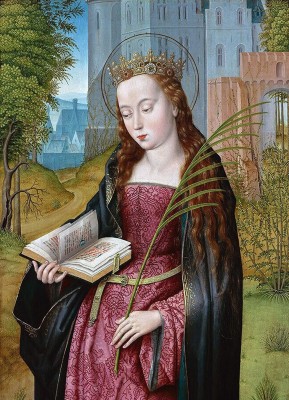 작가 : 자수 잎 장식의 대가(Master of the Embroidered Foliage) 연대 : 약 1500년경 소장 : 보이만스 판 뵈닝언 미술관 기법·시대 : 유화, 북유럽 후기 고딕–초기 르네상스 전환기 유형 : 성인 초상 성화 특징 : • 성녀 바르바라는 왕관을 쓰고 정면에 가까운 자세로 묘사되어 성인의 위엄과 신앙적 정체성을 강조한다. • 손에 든 종려가지는 순교자의 승리를 상징한다. • 다른 손에 펼쳐 든 성서는 신앙의 지혜와 하느님 말씀에 대한 충실함을 나타낸다. • 배경의 탑은 감금과 순교의 전승을 상징하는 성녀 바르바라의 대표적 도상이다. • 세밀한 식물 표현과 장식적인 자연 묘사는 ‘자수 잎 장식의 대가’로 불리는 화가 특유의 장식적 화풍을 보여 준다. ※ 본 작품은 북유럽 후기 고딕에서 초기 르네상스로 넘어가는 전환기 성화 전통 속에서 성인을 경건한 초상 형식으로 제시하는 작품에 해당한다. 작가는 세밀한 자연 묘사와 정제된 색채, 장식적인 직물 표현을 통해 성녀 바르바라의 순교와 신앙의 지혜를 동시에 강조하고자 하였으며, 이러한 표현은 성인을 역사적 인물이 아니라 신앙 공동체가 묵상하는 영적 모범으로 제시하려는 신앙적 의미를 드러낸다.
