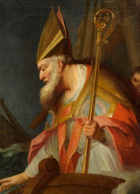※ 이 작품은 19세기 종교화의 특징을 반영하여 사실적이고 인간적인 표현을 통해 성 니콜라스를 묘사한 시기의 경향을 보여주며, 작가는 성인의 자비와 권위를 동시에 드러내고자 화려한 의복과 상징물을 강조하였고, 신앙적으로는 신자들이 성인의 자선과 보호를 가까이 느끼며 그의 덕행을 본받도록 이끄는 데 목적이 있다.