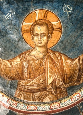 작가 : 미상(비잔틴 계열 프레스코 화가) 연대 : 14세기 소장 : 데차니 수도원 박물관(코소보) 기법·시대 : 프레스코, 비잔틴 후기 유형 : 벽화(흉상) 특징 : • 원형 두광과 십자가 문양이 결합되어, 그리스도의 신성과 구원의 의미를 동시에 드러낸다. • 양팔을 좌우로 펼친 자세는 포용과 축복의 제스처로, 화면 전체에 안정된 대칭 구조를 형성한다. • 굵고 단순화된 선묘와 절제된 색조는 형태를 명확히 하며 영적 집중을 강조한다. • 벽면의 균열과 질감은 프레스코 특유의 물성을 드러내며, 시간의 흐름 속에서도 지속되는 형상을 보여준다. ※ 이 작품은 14세기 비잔틴 후기 프레스코 전통 속에서 제작된 것으로, 장식성과 상징성이 유지되면서도 보다 인간적인 얼굴 표현이 강조되던 시기의 특징을 반영한다. 작가는 정면성과 대칭적 구도를 통해 그리스도를 영원한 질서의 중심으로 제시하면서, 동시에 부드러운 표정과 인체 비례를 통해 신성과 인간성이 함께 드러나도록 의도하였다. 이러한 표현은 신앙을 초월적 존재에 대한 경외와 더불어, 인간과 관계 맺는 하느님의 현존으로 이해하도록 이끈다.