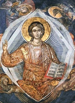 작가 : 미상(아토스 산 디오니시우 수도원 화가) 연대 : 16세기 소장 : 아토스 산 디오니시우 수도원 기법·시대 : 프레스코, 후기 비잔틴 전통 유형 : 돔 천장화(성상 구성) 특징 : • 중앙에 앉아 있는 그리스도를 둘러싼 다층의 광휘(만돌라)는 초월적 영역을 시각적으로 구분한다. • 네 복음사가의 상징(천사, 사자, 황소, 독수리)이 주변에 배치되어 복음의 보편성을 드러낸다. • 오른손의 축복과 왼손의 열린 복음서는 말씀과 심판, 권위의 결합을 상징한다. • 원형 구도와 대칭적 배열은 돔 구조와 결합되어 하늘의 질서를 공간 전체에 확장한다. ※ 이 작품은 16세기 후기 비잔틴 전통이 지속되던 시기의 프레스코로, 오스만 시대 이후에도 수도원 중심으로 유지된 도상 체계를 반영한다. 작가는 중앙의 그리스도를 다층적 만돌라와 상징적 동물들 속에 배치함으로써, 우주의 중심으로서의 그리스도를 드러내고자 하였다. 이러한 구성은 신앙을 단순한 인간적 관계를 넘어, 창조 전체를 포괄하는 질서와 심판의 중심으로 이해하도록 이끌며, 돔이라는 공간 안에서 신적 영광이 공동체 위에 펼쳐지는 방식으로 제시된다.